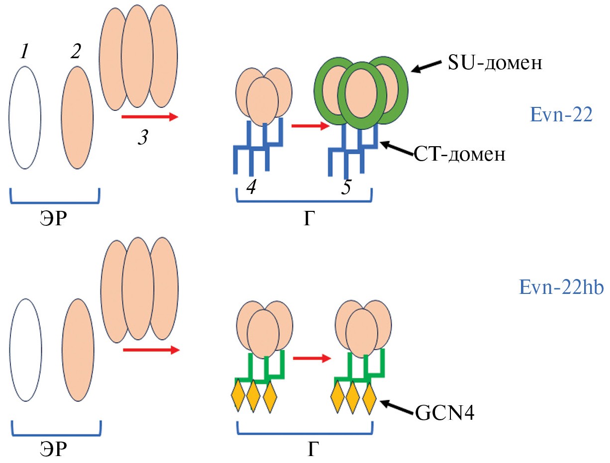 Рис. 2. Трансляция белка Env ВИЧ-1 сопровождается гликозилированием синтезируемой полипептидной цепи и олигомеризацией в тримеры в эндоплазматическом ретикулуме (ЭР) клетки. Олигомеризация способствует перемещению тримеров в аппарат Гольджи (Г), где происходит нарезание полипептидной цепи на SU и трансмембранную субъединицу и дальнейшее созревание углеводной цепи. В составе тримера Env при наличия α-спирали в СТ-домене некоторые субстраты могут быть недоступны для ферментов. (1) Env-предшественник; (2) олигоманнозные цепи (бежевый цвет), присоединенные по остатку аспарагина в сайте потенциального N-гликозилирования (Asn-X-Thr/Ser, где Х ≠ Pro) на мономере Env (gp160); (3) олигомеризация и перемещение тримеров Env; (4) протеолитическое расщепление gp160 клеточным фурином с образованием gp120 и gp41; (5) процессинг углеводных цепей и образование комплексных гликанов (зеленый цвет). Описание состава белков Env-22 и Env-22hb см. в табл. 1.