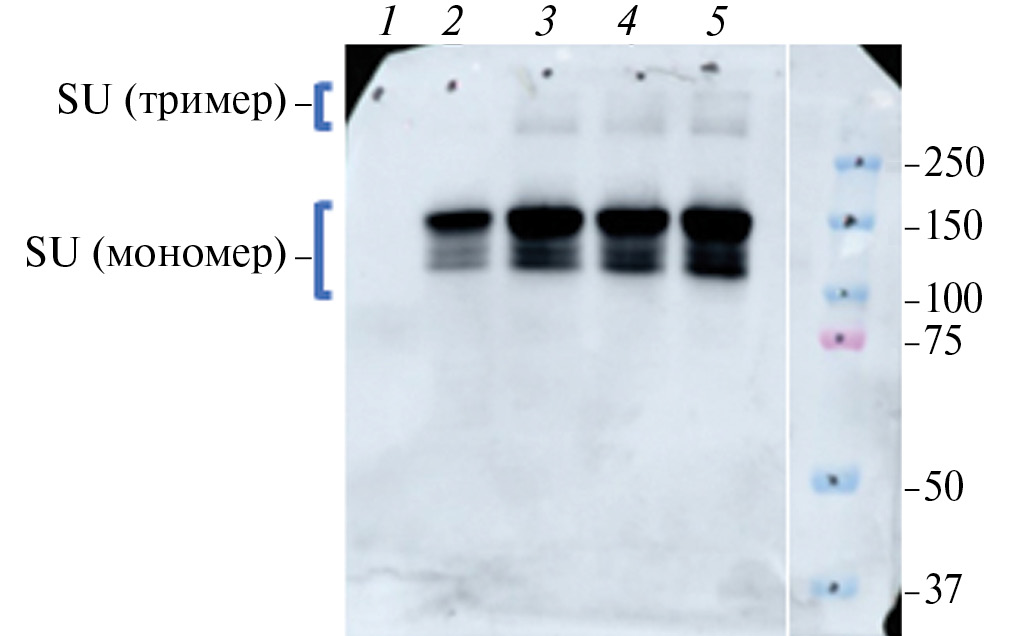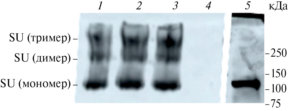 Рис. 3. Образование тримеров белком Env ВИЧ-1, экспрессируемым VVEnv-22. Клетки Hep2 заражали вирусом с разной множественностью инфекции (MOI): 0.1 (дорожка 1), 0.2 (дорожка 2), 0.5 (дорожки 3, 5) БОЕ/клетка. Негативный контроль – неинфицированные клетки Hep2 (дорожка 4). Через 48 ч клетки снимали и очищали фракцию плазматических мембран, содержащую белки ВИЧ-1. Образцы растворяли в буфере для нанесения образцов без восстановителей при комнатной температуре (дорожки 1‒3) или c восстановителями (200 мM дитиотреитол, 200 мМ β-меркаптоэтанол, 8 М мочевина) 5 мин при 96°C (дорожка 5). Белки разделяли в 4–15%-ном SDS-PAAG и анализировали методом иммуноблотинга.