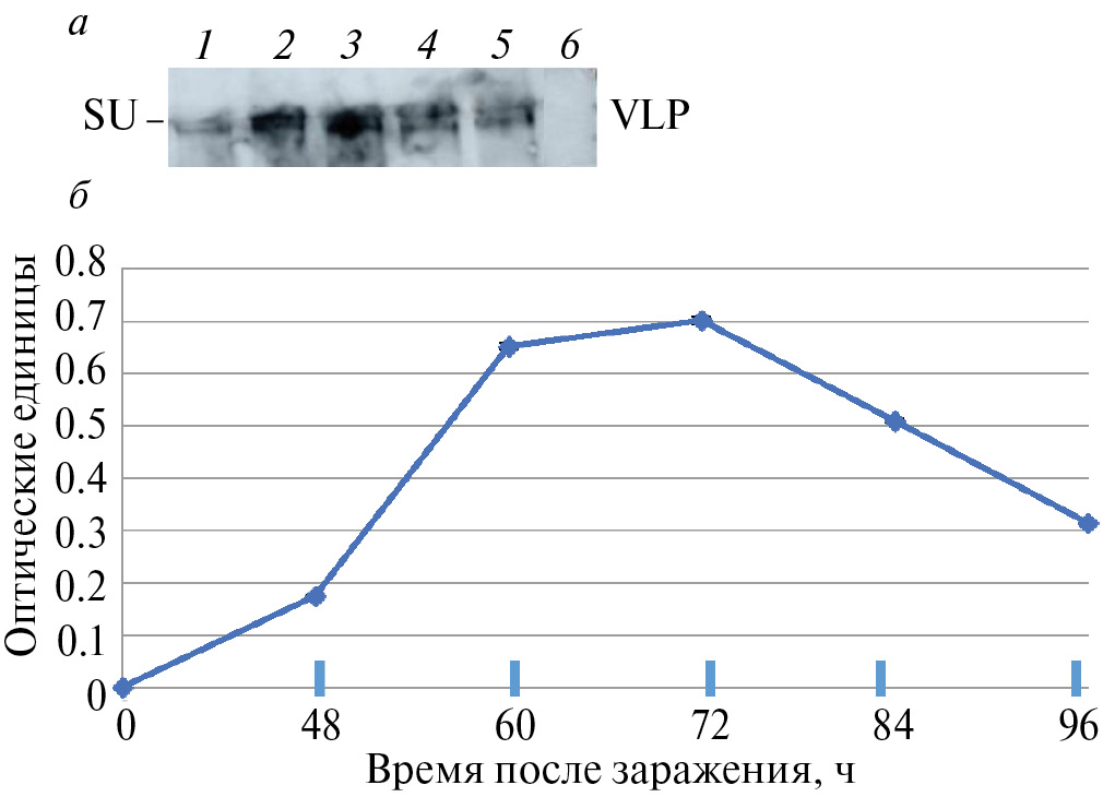 Рис. 4. Кинетика продукции VLP ВИЧ-1. а – Анализ продукции VLP методом иммуноблотинга. Клетки CHO коинфицировали тремя вирусами: VVCP : VVEnv-22 : VVGag-Pol в соотношении 1 : 1 : 1 – с MOI 0.5 БОЕ/клетка; культуральную среду, содержащую VLP, собирали на 0 (дорожка 6), 48 (1), 60 (2), 72 (3), 84 (4) и 96 (5) ч после начала заражения. б – Денситометрический анализ проведен с использованием программного обеспечения ImageJ. Данные представлены на основании двух независимых экспериментов.