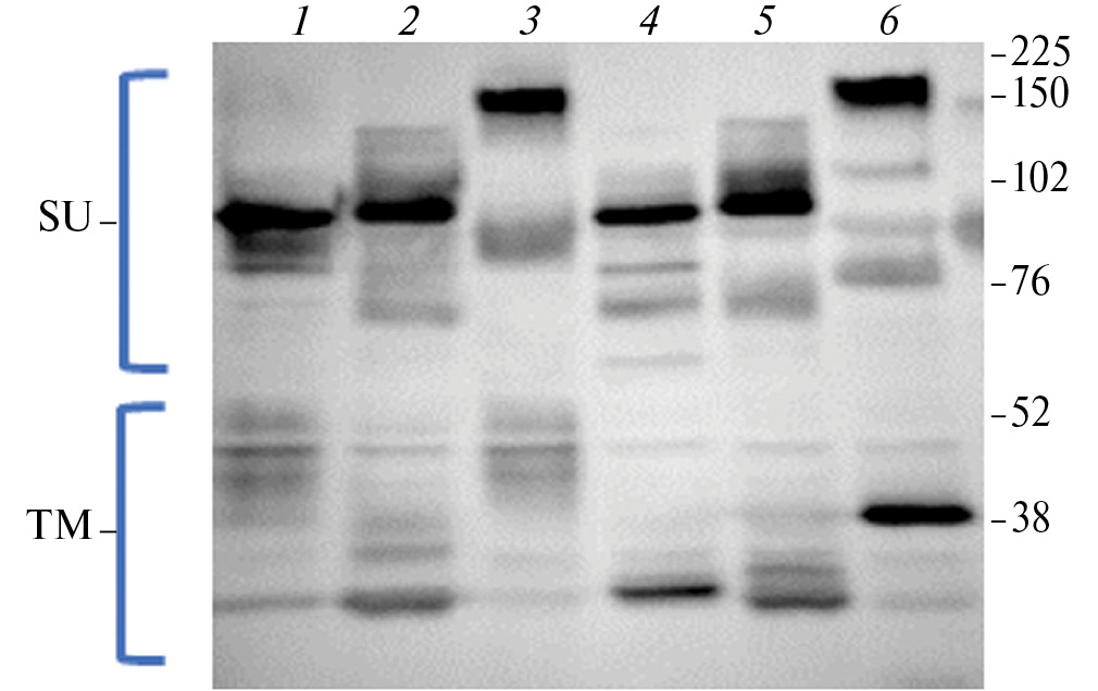 Как видно из результатов, приведенных на рис. 3, белок Env с укороченным СТ-доменом, без тримеризирующей последовательности GCN4, образовывал в клетках Нeр2 тримеры gp120SU, которые при одновременном воздействии высокой температуры и химических восстановителей распадались на мономеры (рис. 3, дорожка 5). Таким образом, продемонстрирована способность белка Env, не содержащего тримеризующей последовательности в СТ-домене, формировать тримеры на поверхности мембраны клеток Нeр2.
