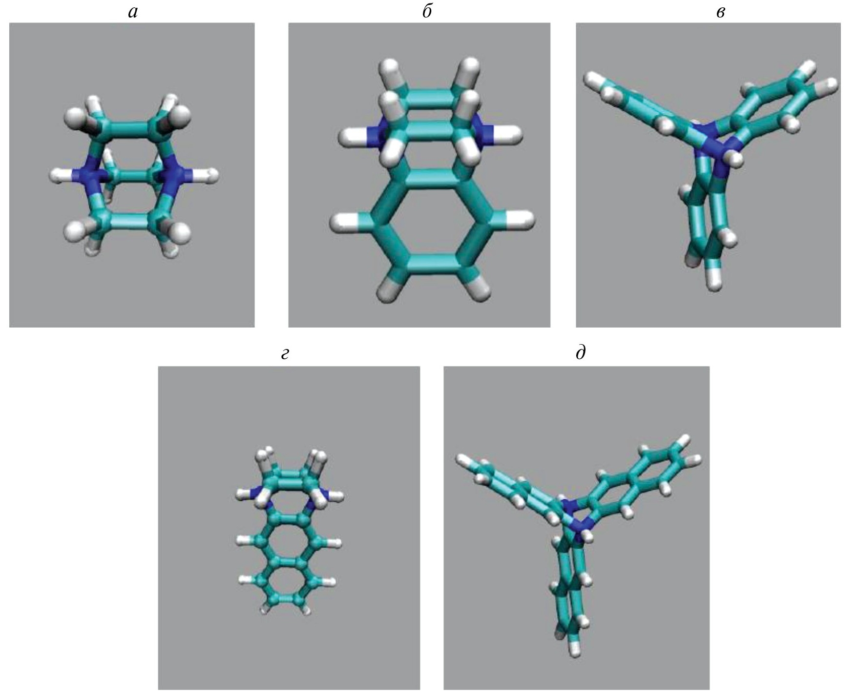 Рис. 1. Структура молекул блокаторов Е- и М2- каналов. a – DABCO; б – DABCOB; в – DABCO3B; г – DABCON; д – DABCO3N.