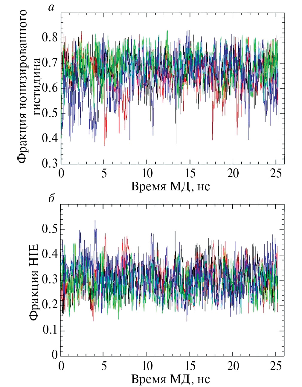 Рис. 2. Ионизированная HIS+-фракция остатков гистидина (а) и фракции нейтрального таутомера HIE (б). His37A (черный цвет), His37B (красный), His37C (синий), HIS37D (зеленый), белка М2 при рН 6.5, Т =300К, вдоль равновесной МД траектории в 25 нс.