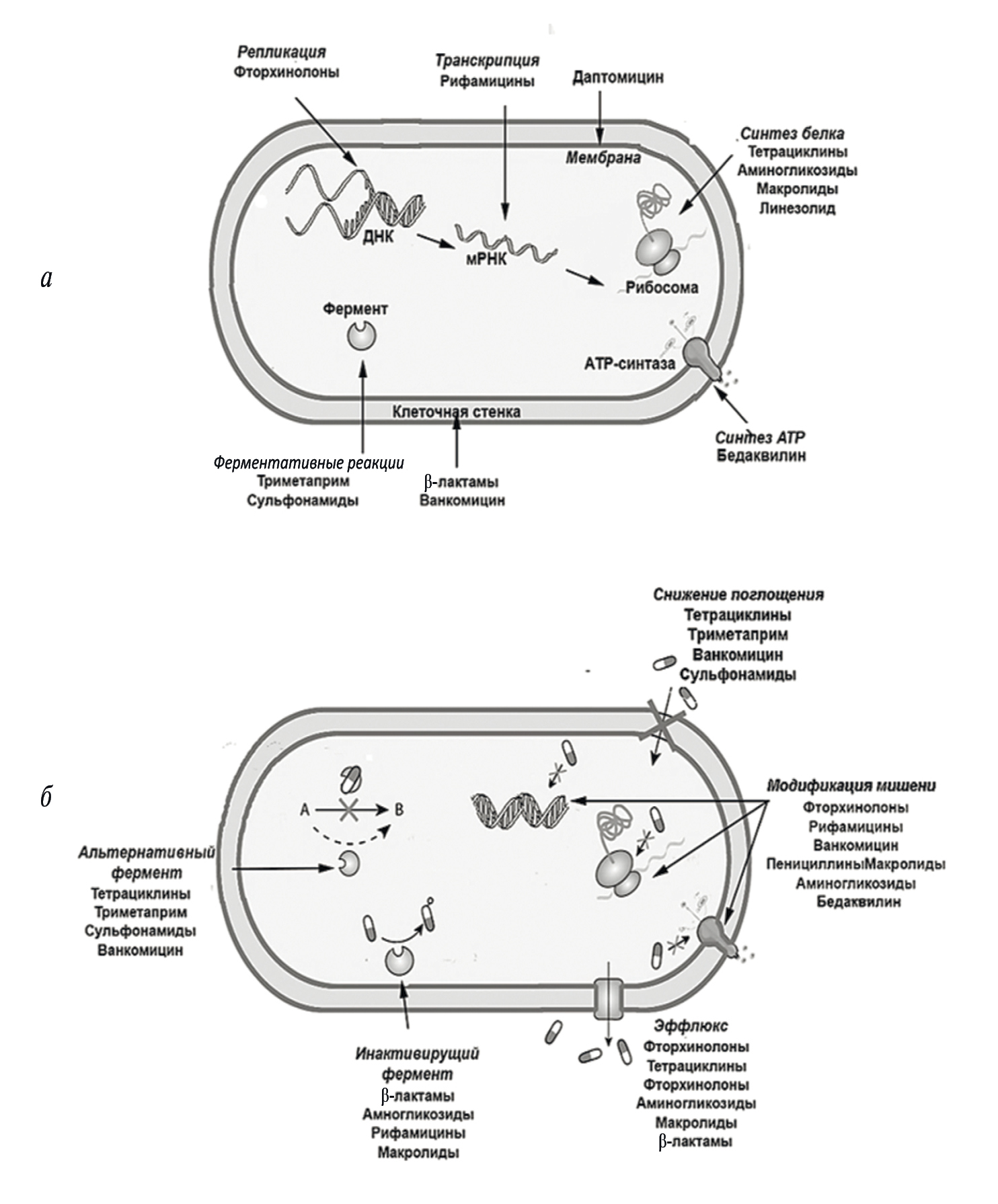 Рис. 3. Мишени действия антибиотиков (а) и основные механизмы резистентности (б) к ним.