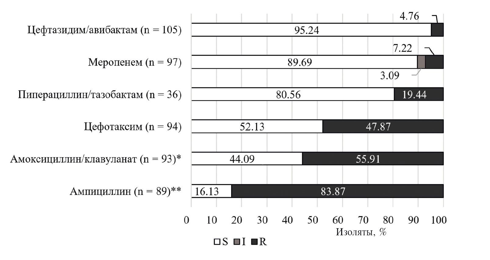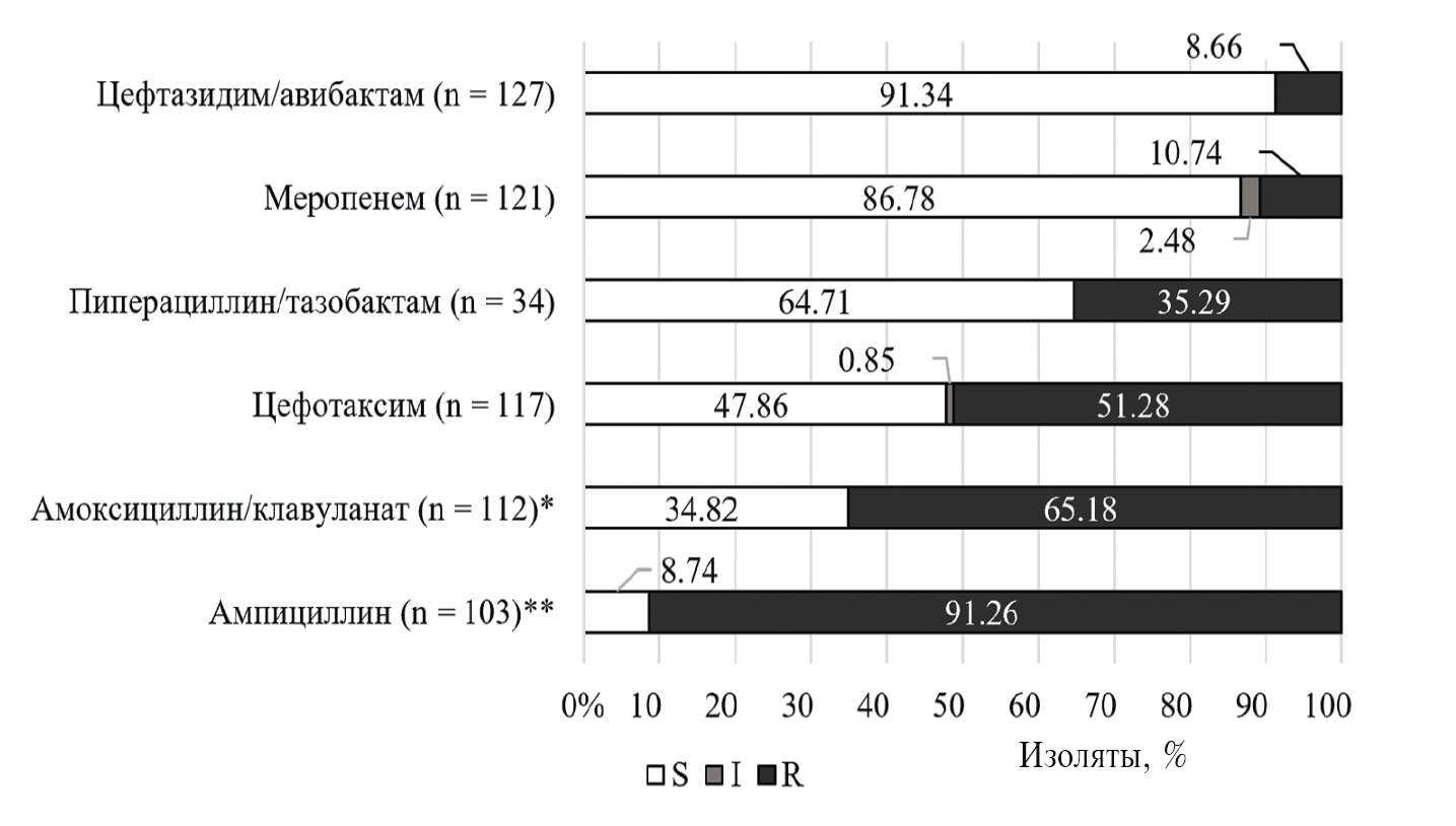 Рис. 1. Чувствительность к антибактериальным препаратам Enterobacterales, выделенных в терапевтических отделениях. Обозначения: *среди них идентифицировано 5 изолятов, продуцирующих хромосомные цефалоспориназы AmpC (E. cloacae complex – 4, K. aerogenes – 1); **среди них ‒ 35 изолятов, продуцирующих хромосомные цефалоспориназы AmpC и β-лактамазы широкого спектра (K. pneumoniae – 29, E. cloacae complex – 4, K. aerogenes – 1, K. oxytoca – 1); S ‒ чувствительные, I ‒ чувствительные при увеличенной экспозиции, R ‒ резистентные бактерии.