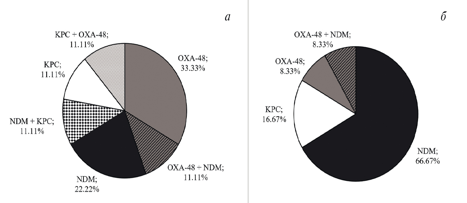 Рис. 3. Типы карбапенемаз у Enterobacterales, выделенных от пациентов терапевтических (а) и хирургических (б) отделений.