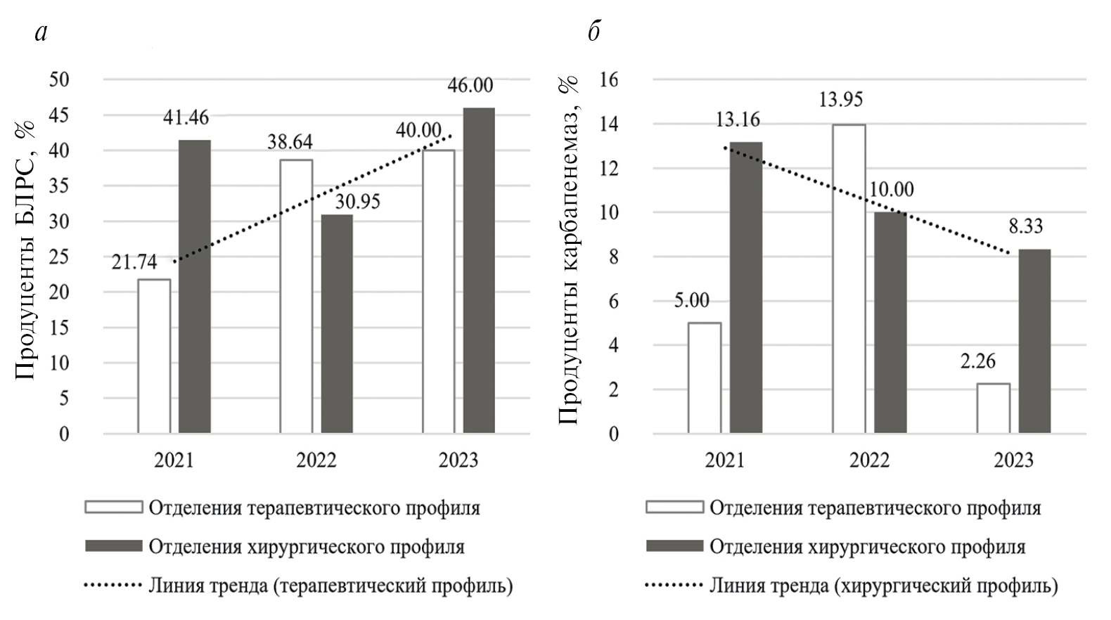 Рис. 4. Динамика изменения доли продуцентов БЛРС (а) и карбапенемаз (б) среди Enterobacterales, выделенных от госпитализированных пациентов, за 2021‒2023 гг.
