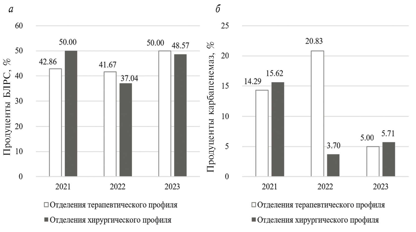 Статистически значимых изменений в доле продуцентов БЛРС и карбапенемаз за период исследования нами не выявлено (p > 0.05) (рис. 4). Однако можно заметить, что доля Enterobacterales с продукцией БЛРС в отделениях терапевтического профиля за три года выросла на 18.26% от исходных 21.74% (достигла 46%), а доля продуцентов карбапенемаз в отделениях хирургического профиля за это время снизилась на 4.83% от исходных 13.16% (до 8.33%).