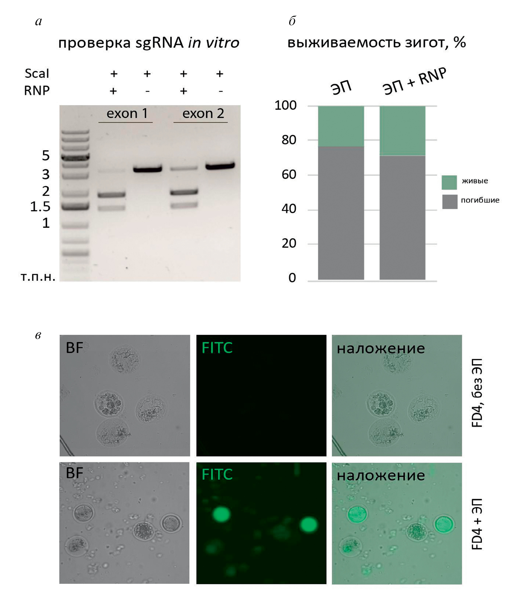 Рис. 2. Адаптация и тестирование метода i-GONAD. а – Тестирование sgРНК in vitro. Электрофорез в агарозном геле ScaI-линеаризованного вектора pBlueScript SK (+), несущего фрагмент геномной области экзона 1 или экзона 2 гена Il10. RNP – рибонуклеарные комплексы sgРНК и белка Cas9. б – Выживаемость зигот in vitro после электропорации in utero. ЭП – электропорация. в – Тест на эффективность электропорации in utero с использованием 4кДa FITC-декстран (FD4).