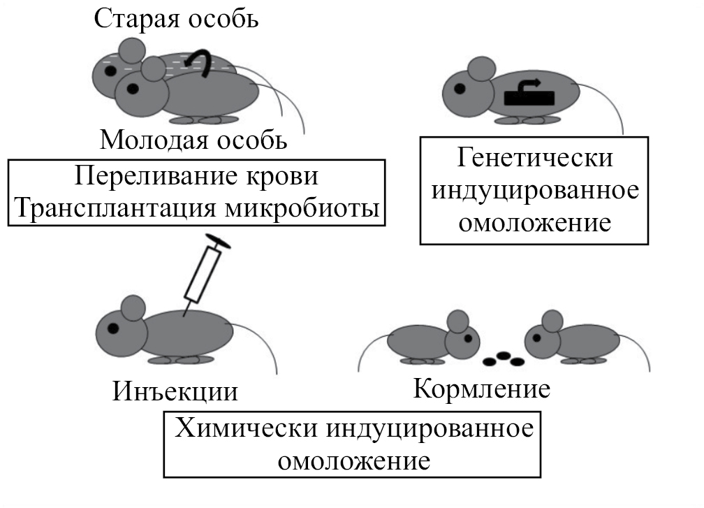 Понятие “омоложение” тесно связано с понятием репрограммирование старения. Репрограммирование старения – это один из эффективных подходов к увеличению продолжительности жизни и снижению вредных фенотипических проявлений старения, основанный на использовании эктопической временной экспрессии в клетках факторов транскрипции, применяемых для репрограммирования соматических клеток в плюрипотентные стволовые клетки. Репрограммирование старения приводит к омоложению эпигенома, а именно, к восстановлению паттерна метилирования ДНК и различных модификаций хроматина, характерных для более молодого возраста. Репрограммирование старения обращает вспять возрастные изменения не только эпигенома, но и транскриптома, что указывает на существование связи между эпигенетическим и транскриптомным омоложением [4]. Например, в дермальных фибробластах репрограммирование снижает средний возраст эпигенома и транскриптома примерно на 30 лет, улучшает продукцию коллагенов и медианную скорость миграции клеток [4]. Глобальный мультиомиксный эффект омоложения наблюдается в результате гетерохронного парабиоза [5], при котором хирургически сшитые старые и молодые мыши имеют общий кровоток. В результате такой манипуляции снижается эпигенетический возраст клеток крови и печени, а также омолаживаются их транскриптомы, что приводит к увеличению продолжительности жизни и здоровья мышей [5]. Более того, в ответ на одноциклическую активацию факторов репрограммирования в ряде тканей стареющих мышей наблюдается омоложение на уровне метилирования ДНК, транскрипции, а также метаболома [6]. Омоложение метаболома и транскриптома также происходит при трансплантации микробиоты от молодых мышей старым, что приводит к снижению возрастных нарушений когнитивного поведения [7].