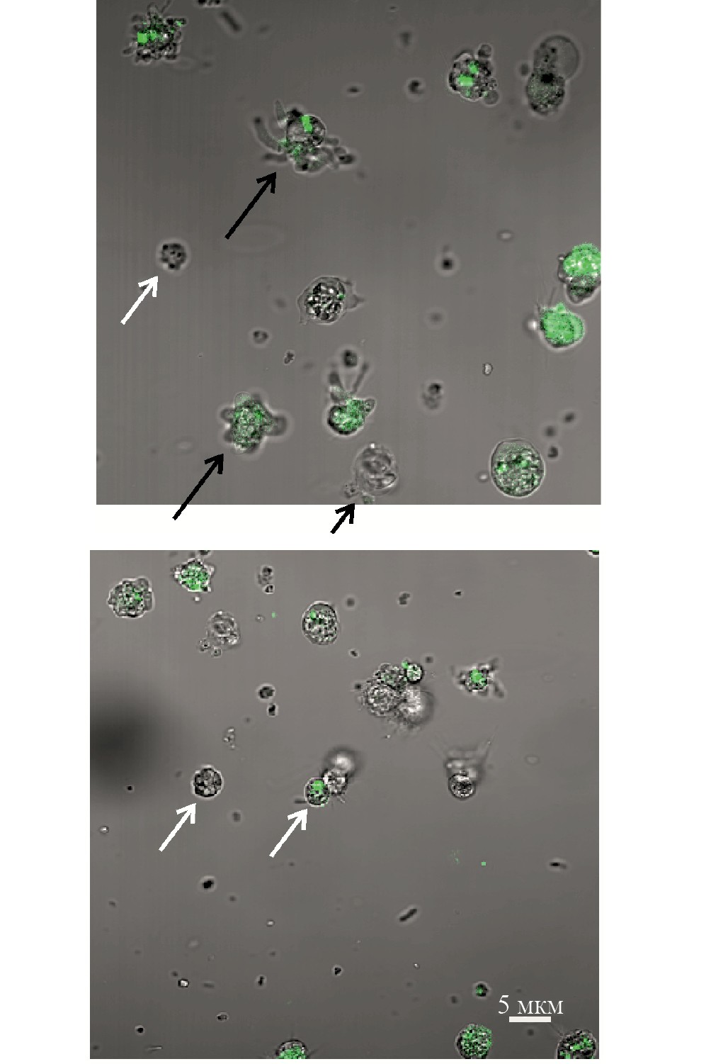 Рис. 8. Конфокальная микроскопия суспензии клеток губки H. dujardinii. Зеленым цветом показана флуоресценция клеток после добавления в инкубационную среду H2DCFDA. Белыми стрелками показаны мелкие округлые клетки, черными – крупные с выростами.