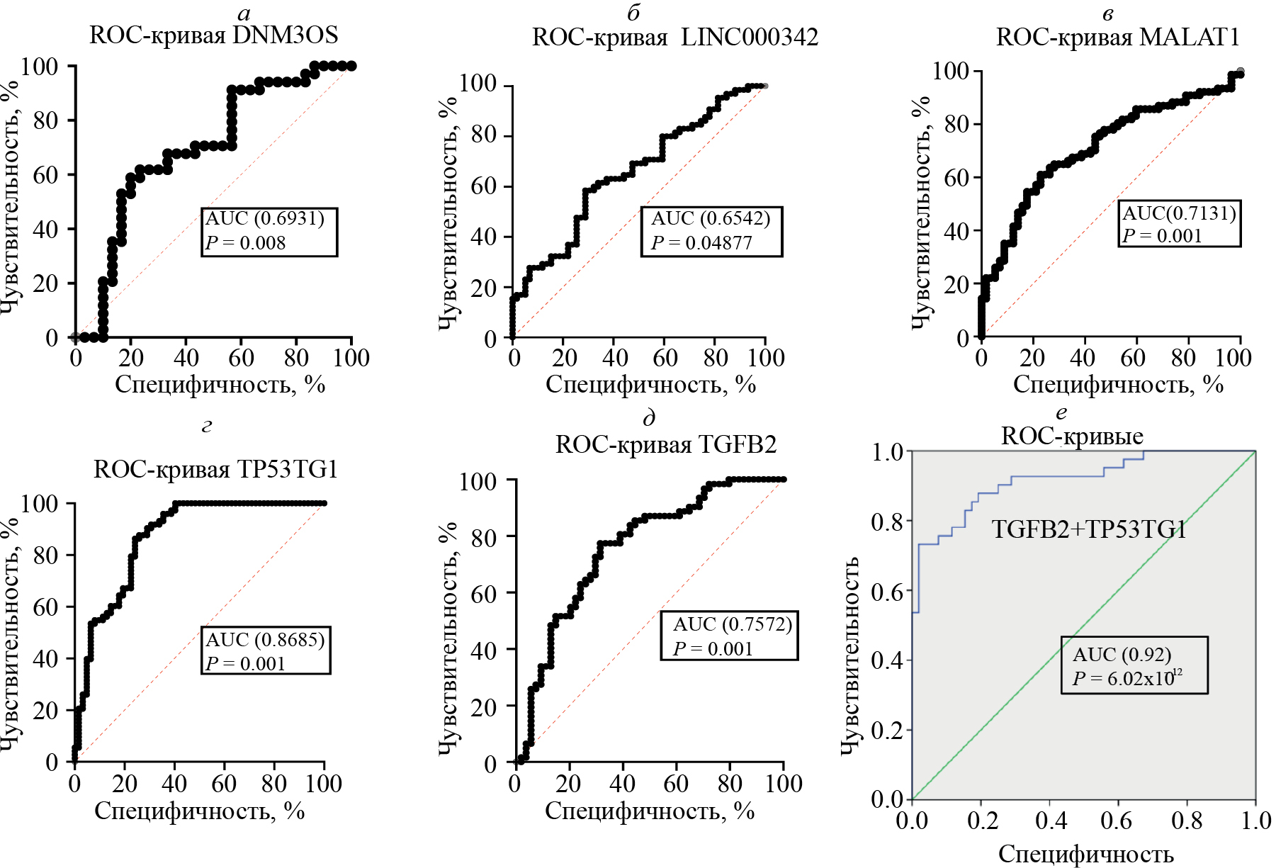 Статистический анализ проводили с использованием программного обеспечения GraphPad Prism 9 Software (GraphPad Software, https://www.graphpad.com) и IBM SPSS Статистика 22.0. Рассчитывали средние значения и стандартные отклонения (среднее ± SD), медиану и 25–75% межквартильный размах (медиана 25–75% IQR), группы сравнивали с помощью непараметрического U-теста Манна–Уитни (если распределение данных отличалось от нормального) или теста Стьюдента (для данных с нормальным распределением). Частоты качественных признаков сравнивали с помощью теста χ2. Уровень P < 0.05 считали статистически значимым. Относительный уровень экспрессии оценивали с помощью метода ΔΔСt, который основан на предположении, что разница в пороге цикла (ΔCt) между целевым и референсным генами пропорциональна относительной экспрессии целевого гена; результаты нормировали по уровню экспрессии гена домашнего хозяйства B2M и соответствующих генов по следующей схеме ∆Ct = Ct (целевой ген) – Ct (ген домашнего хозяйства) [34]. Относительный уровень экспрессии каждого гена представлен в виде (2–ΔΔCt) [34]. Различия в уровне относительной экспрессии в группе больных и в контроле рассчитывали с помощью непараметрического U-теста Манна–Уитни. Оценивали кратность изменения экспрессии у больных по сравнению с контролем (Fold Change) (2(–ΔΔCt) ХОБЛ / 2(–ΔΔCt) контроль) и кратность снижения или увеличения уровня экспрессии у больных (Fold Regulation), при этом для величин Fold Change < 1 Fold Regulation = (–1/ Fold Change). Корреляцию между переменными определяли с помощью непараметрического анализа с вычислением коэффициента корреляции Спирмена. Прогностическую значимость оценивали с помощью ROC-анализа (receiver operating characteristic analysis), с вычислением площади под кривой (АUC – area under the curve) с расчетом чувствительности и специфичности. Наиболее значимые модели идентифицировали с использованием множественного регрессионного анализа с пошаговым включением значимых предикторов с последующим ROC-анализом для оценки эффективности прогностической модели.