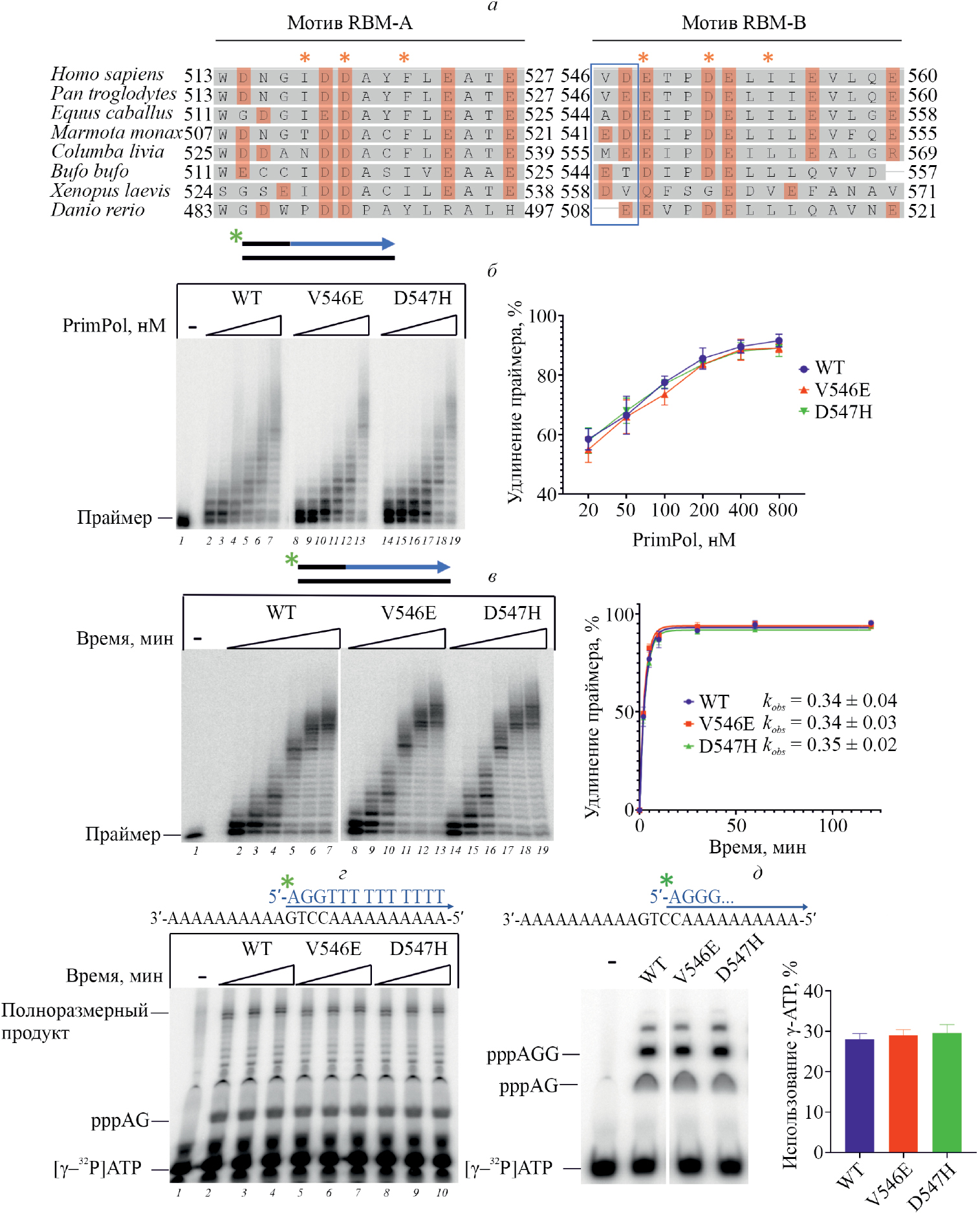 Рис. 1. Сравнение каталитической активности PrimPol дикого типа и вариантов V546E и D547H. а – Выравнивание аминокислотных последовательностей RBM-A и RBM-B PrimPol из организмов разных таксонов. Красным отмечены отрицательно заряженные остатки Asp и Glu. Оранжевыми звездами отмечены остатки PrimPol, образующие связи с субъединицей RPA70, согласно структуре [9]. б – ДНК-полимеразная активность PrimPol и вариантов с заменами V546E и D547H. Реакции проводили в присутствии 20/50/100/200/400/800 нМ PrimPol в течение 10 мин. в – ДНК-полимеразная активность PrimPol и ее вариантов в зависимости от времени реакции, а также значения параметра kobs. Реакции проводили в присутствии 200 нМ PrimPol в течение 2/5/10/30/60/120 мин. г – Общая ДНК-праймазная активность PrimPol и вариантов с заменами V546E и D547H. Реакции проводили в присутствии [γ-32P]ATP, ATP, dGTP и dTTP в течение 30/60/90 мин. д – Образование динуклеотида PrimPol дикого типа и вариантами V546E и D547H. Реакции проводили в присутствии [γ-32P]ATP, ATP и dGTP в течение 30 мин.