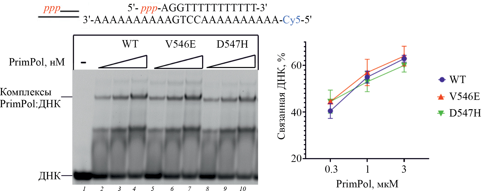 Рис. 2. Анализ сдвига комплекса PrimPol дикого типа и вариантов с заменами V546E и D547H с ДНК в нативном геле. Представлены средние значения и стандартные ошибки.