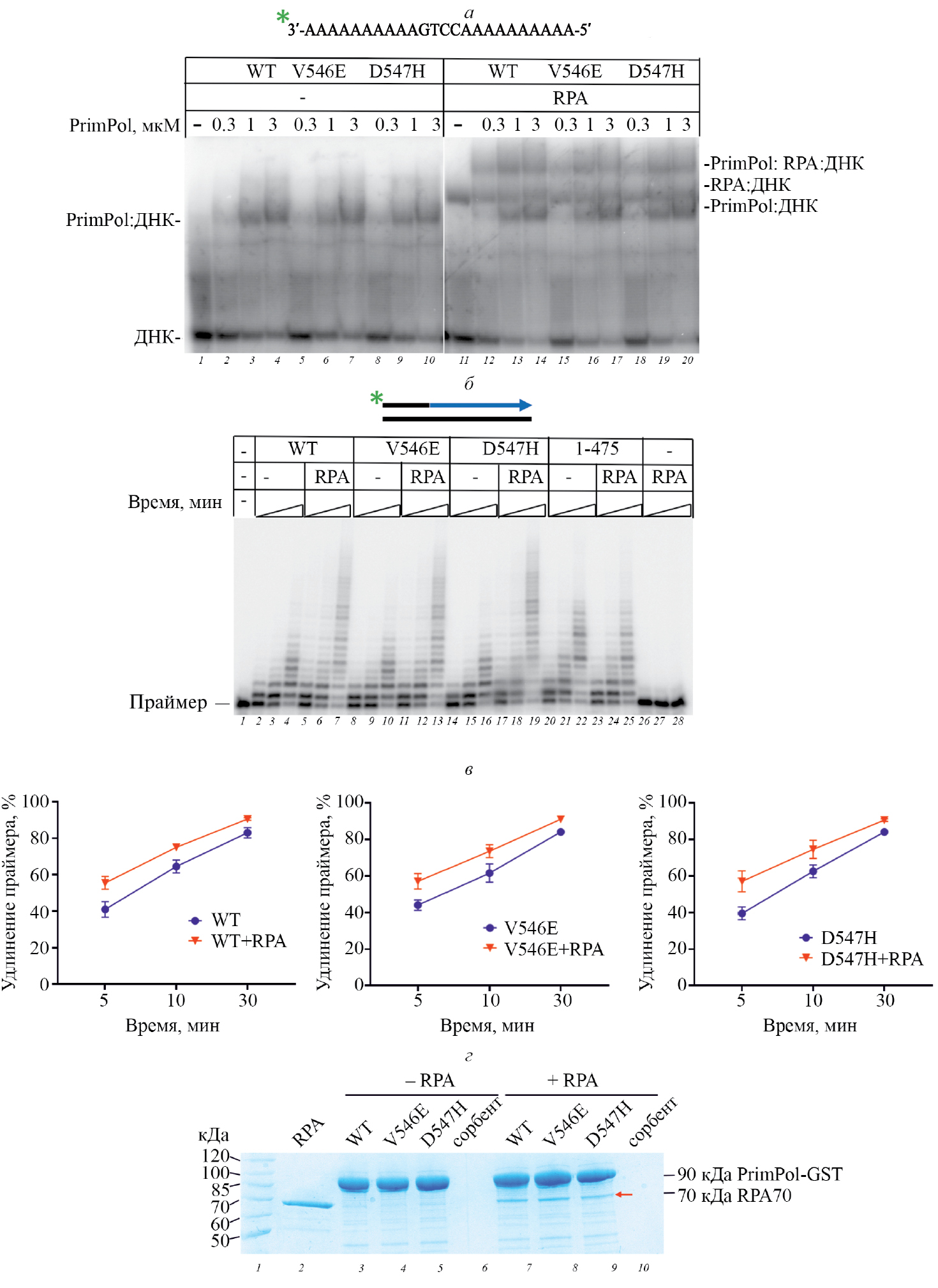 Рис. 3. Анализ влияния замен V546E и D547H на взаимодействие PrimPol с репликативным белком RPA. а – Образование тройного комплекса RPA:ДНК:PrimPol в 5%-ном нативном геле. б –Электрофореграмма реакций удлинения праймера. ДНК-полимеразные реакции проводили в присутствии 100 нМ PrimPol или ее вариантов в течение 5/10/30 мин. в – Графики, отражающие эффективность удлинения праймера в зависимости от времени реакции. Представлены средние значения и стандартные ошибки. г – Соосаждение PrimPol дикого типа и вариантов V546E и D547H с белком RPA. Красной стрелкой обозначено положение полосы субъединицы RPA70, образовавшей комплекс с GST-PrimPol.