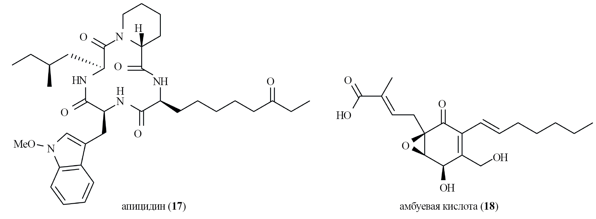 Как природные, так и синтетические ингибиторы Agr-системы активно изучаются с момента ее открытия в начале 90-х годов ХХ века. К 2019 г. было известно примерно о 20 соединениях, выделенных из растений и микроорганизмов, способных непосредственно влиять на Agr-систему [77, 78]. Показано антагонистическое действие на Agr-систему стафилококка апицидина (17) (рис. 8), циклического тетрапептида из наземного гриба Chaetosphaeriaceae sp. [79], амбуевой кислоты (ambuic acid) (18) (см. рис. 8), выделенной из различных грибов, в том числе представителей родов Monochaetia и Pestalotiopsis [80]. Циклический пептид авелланин С был выделен из гриба Hamigera ingelheimensis, и его влияние на Agr-систему S. aureus показано с помощью трансформанта с плазмидой, содержащей ген люциферазы под промотором гена agrP3 [81]. Показано влияние на Agr-систему S. aureus полигидроксиантрахинона ω-гидроксиэмодина из эндофитного гриба P. restrictum [82], а также ряда других полигидроксиантрахинонов, выделенных из P. restrictum [83].