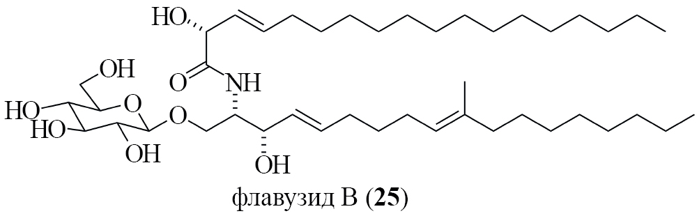 Выделенный из морского гриба P. islandicum цереброзид флавузид В (25) (рис. 10) не только ингибировал активность сортазы А и образование биопленок S. aureus, но и в экспериментах с инфицированием кератиноцитов линии HaCaT бактериями S. aureus увеличивал жизнеспособность кератиноцитов, снижал уровень апоптоза, маркеров воспаления и восстанавливал прохождение инфицированными кератиноцитами стадий клеточного цикла [99].
