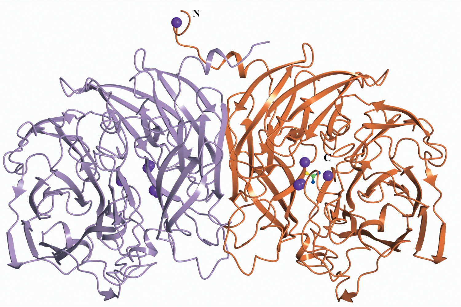Рис. 1. Димер pmTcDH из структуры комплекса с тиомочевиной. Субъединицы в “закрытой” и “открытой” конформациях показаны в виде ленточной модели справа и слева соответственно. Ионы меди pmTcDH показаны сферами. Молекула тиомочевины представлена в виде шаростержневой модели.