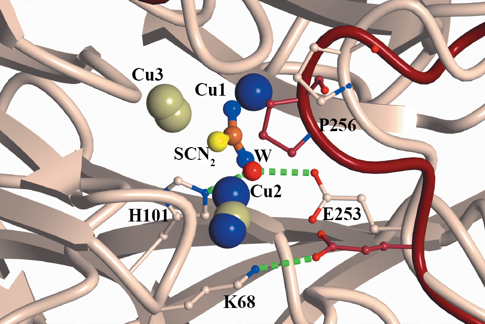 В начале каталитического цикла (стадия a) молекула фермента находится в “открытой” конформации. Ионы Cu1(II) и Cu2(II) окислены и ион Cu3(I) находится в восстановленном состоянии. Ионы Cu1 и Cu3 координированы двумя молекулами воды. Третья молекула воды (“атакующая” вода W, см. рис. 3в) образует водородную связь с остатками E253 и H101. Аминокислотный остаток K68 координирует ион меди Cu2. Благодаря электростатическому притяжению, ион SCN– (субстрат) входит в активный центр, находящийся в “открытой” конформации. При вхождении в активный центр ион SCN– восстанавливает ион меди Cu2(II), входящий в электронно-транспортную цепь, до Cu2(I). Связывание нейтрального радикала SCN·сопровождается замещением им двух молекул воды, координирующих ионы Cu1 и Cu3. Восстановление иона Cu2 вызывает его смещение от K68 и изменение его координационной сферы (в плоскую тригональную координацию) с потерей его координации K68. Именно это изменение координации Cu2 инициирует трансформацию “открытой” конформации активного центра в “закрытую”. Это изменение конформации субъединицы ведет к разрыву водородной связи между E253 и “атакующей” водой W и смещению ее боковой цепи в протонированном состоянии (объяснено ниже) к K68. В “закрытой” конформации E253 образует с K68 водородную связь за счет этого протона, которая компенсирует потерю координационной связи K68 с ионом меди в открытой конформации субъединицы.