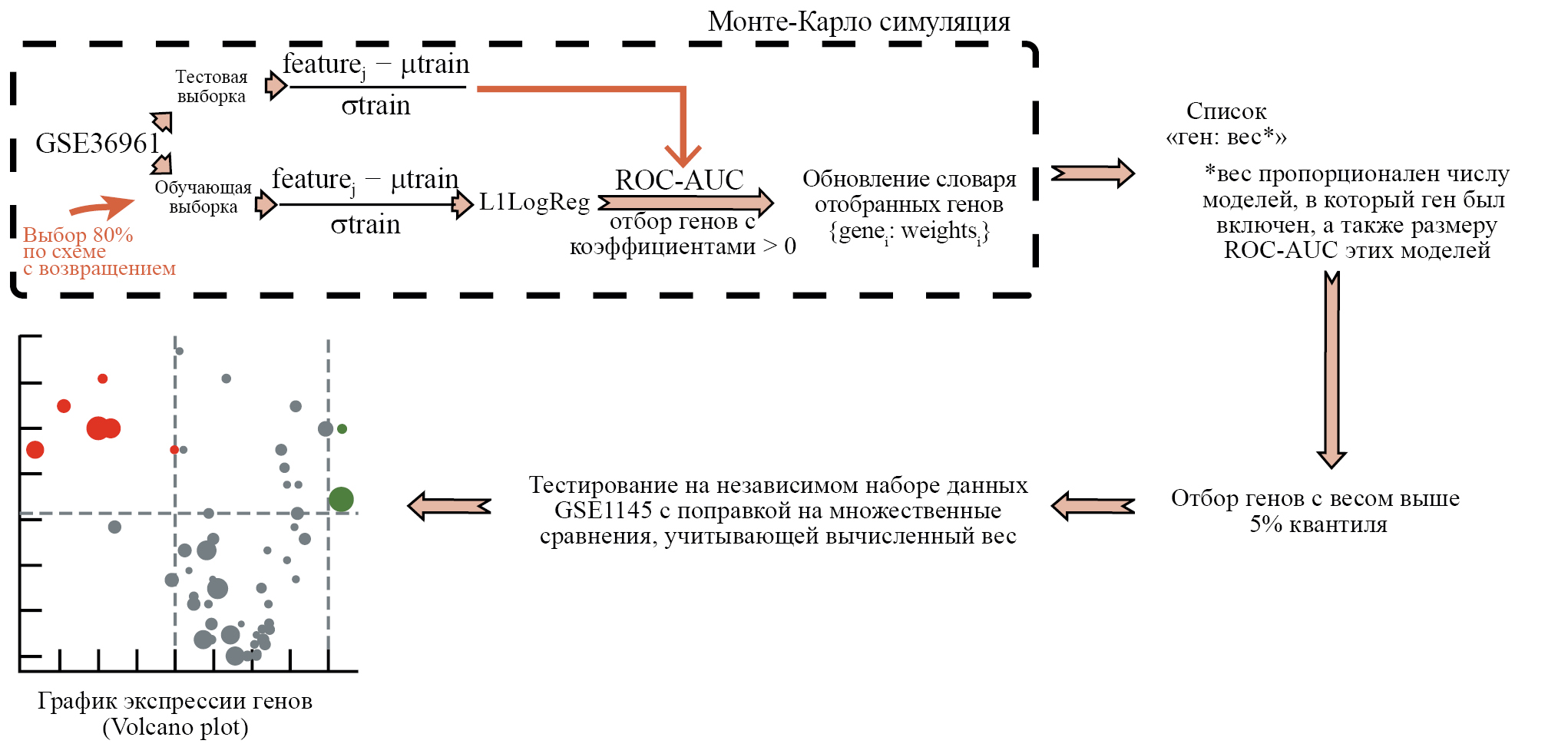Суть подхода заключается в том, чтобы на данных транскриптомного профилирования разыграть методом Монте-Карло классификаторы с высокой обобщающей способностью. Далее из этих классификаторов извлекаются важные для их работы признаки, или ключевые гены и формируется редуцированное пространство признаков для последующего тестирования в нем гипотез об ассоциации стандартными методами. Полученное пространство признаков также будет взвешенным пространством, т.е. с заданной на нем весовой функцией или мерой. Вес будет задаваться как доля моделей, в которую был включен ген, умноженная на метрику качества ROC-AUC, усредненную по этим моделям. Этот вес будет использоваться при проведении взвешенных процедур коррекции на множественное тестирование гипотез, таких как взвешенные методы Бонферрони, Холма или Бенджамини–Хохберга.