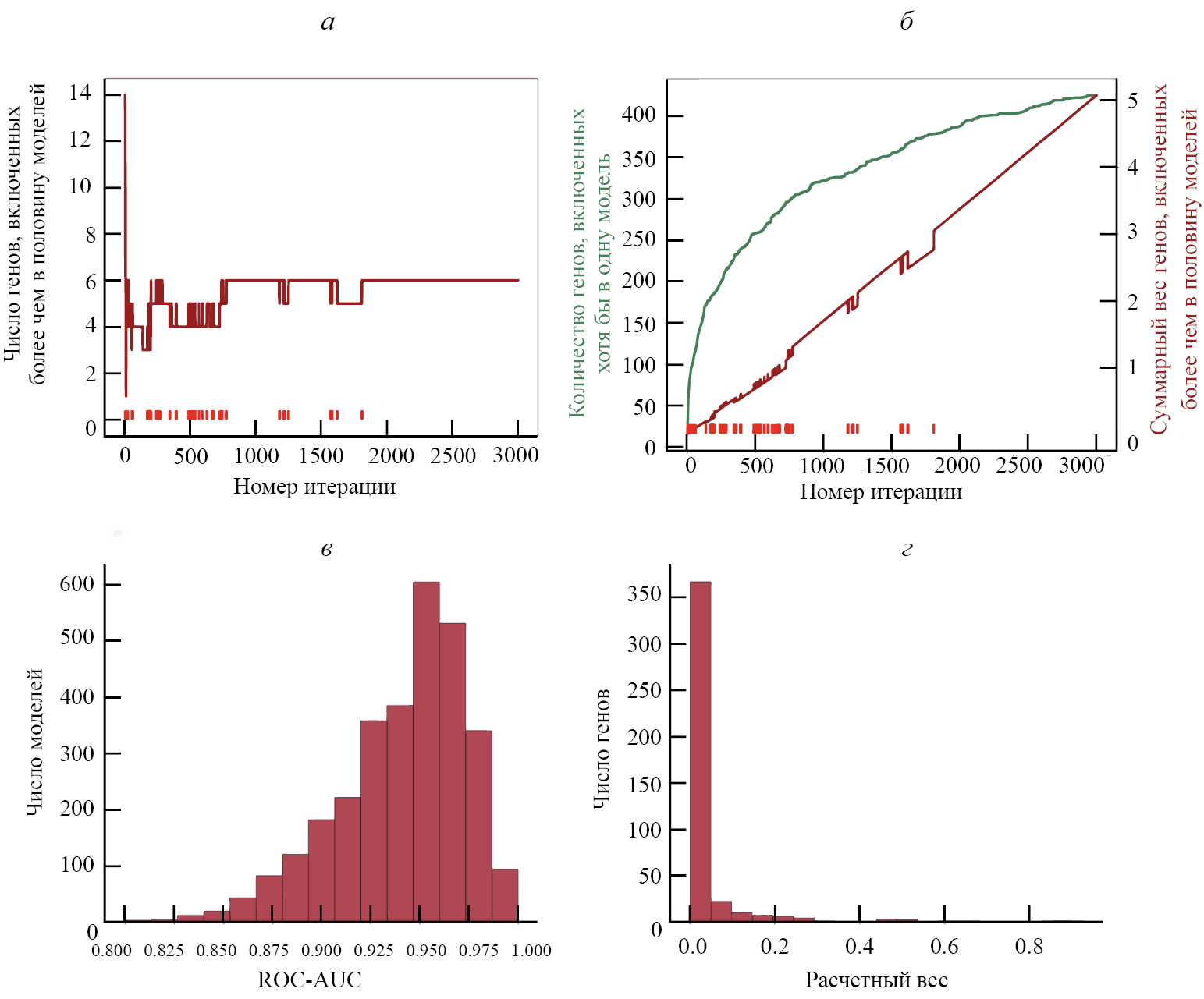 Рис. 2. Результаты проведения Монте–Карло симуляций по обучению классификаторов. а — Сходимость алгоритма по объему множества наиболее значимых генов; красные штрихи вдоль оси абсцисс показывают моменты изменения состава этого множества. б — Динамика роста в зависимости от итерации алгоритма числа отбираемых генов (зеленая линия); веса генов, включенных более чем в половину моделей (красная линия); итерация, на которой изменено множество наиболее значимых генов (красные вертикальные штрихи вдоль оси абсцисс). в — Гистограмма распределения меры ROC-AUC для ML-классификаторов в 3000 симуляциях Монте–Карло. г — Гистограмма распределения расчетного веса генов, включенных, по крайней мере, в одну модель.