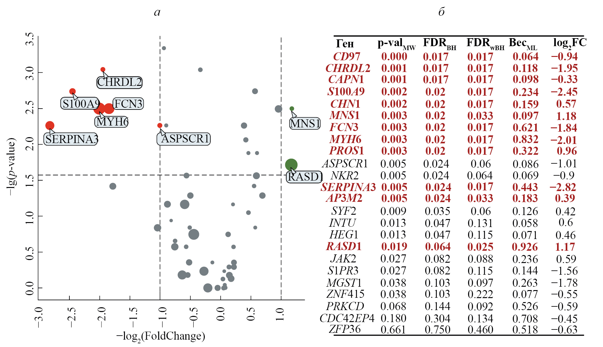 Рис. 3. Тестирование гипотез об ассоциации отобранных генов на независимом наборе данных GSE1145. а — График сравнения экспрессии генов (Volcano plot), размер точек обозначает их ВесML. б — Сводная таблица статистик; показаны только значимые (по p-value) результаты. p-valMW — p-value по критерию Манна–Уитни; FDRBH — поправка на множественные сравнения Бенджамини–Хохберга; FDRwBH — взвешенная поправка на множественные сравнения Бенджамини–Хохберга; ВесML — вес гена, отображающий его значимость для классификационных моделей по результатам Монте–Карло симуляций; log2FC — логарифм отношения средних.