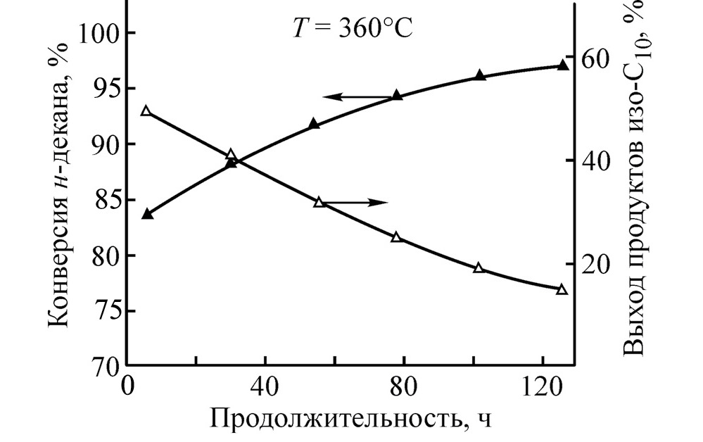 Тестирование каталитических свойств образцов проводили в проточном трубчатом реакторе при следующих условиях: P = 3.5 МПа, T = 320–370°C, массовая скорость подачи сырья = 2.35 ч−1, отношение H2 /сырье = 450 нм3/м3. Непосредственно перед испытанием катализаторы подвергали жидкофазному сульфидированию in situ по методике, описанной в [18]. Модельное сырье для испытаний представляло собой н-декан с добавлением диметилдисульфида (ДМДС), обеспечивающего постоянство химического состава катализаторов, и анилина, стабилизирующего каталитические показатели в условиях испытаний. ДМДС и анилин добавляли в количестве, эквивалентном содержанию серы и азота 500 и 15 ppm соответственно. Расчет конверсии н-декана, селективности в направлении изомеризации и выхода продуктов изо-C10 осуществляли на основании результатов хроматографического анализа газовых и жидких проб на газовом хроматографе Хроматэк-Кристалл 5000. Продолжительность каждого испытания составляла не менее пяти суток. Для проверки стабильности каталитических показателей с течением времени в некоторых испытаниях в конце цикла возвращались к начальным условиям. Показатели в начале и в конце цикла показывали хорошую сходимость при превращении модельного сырья, содержащего ДМДС и анилин.