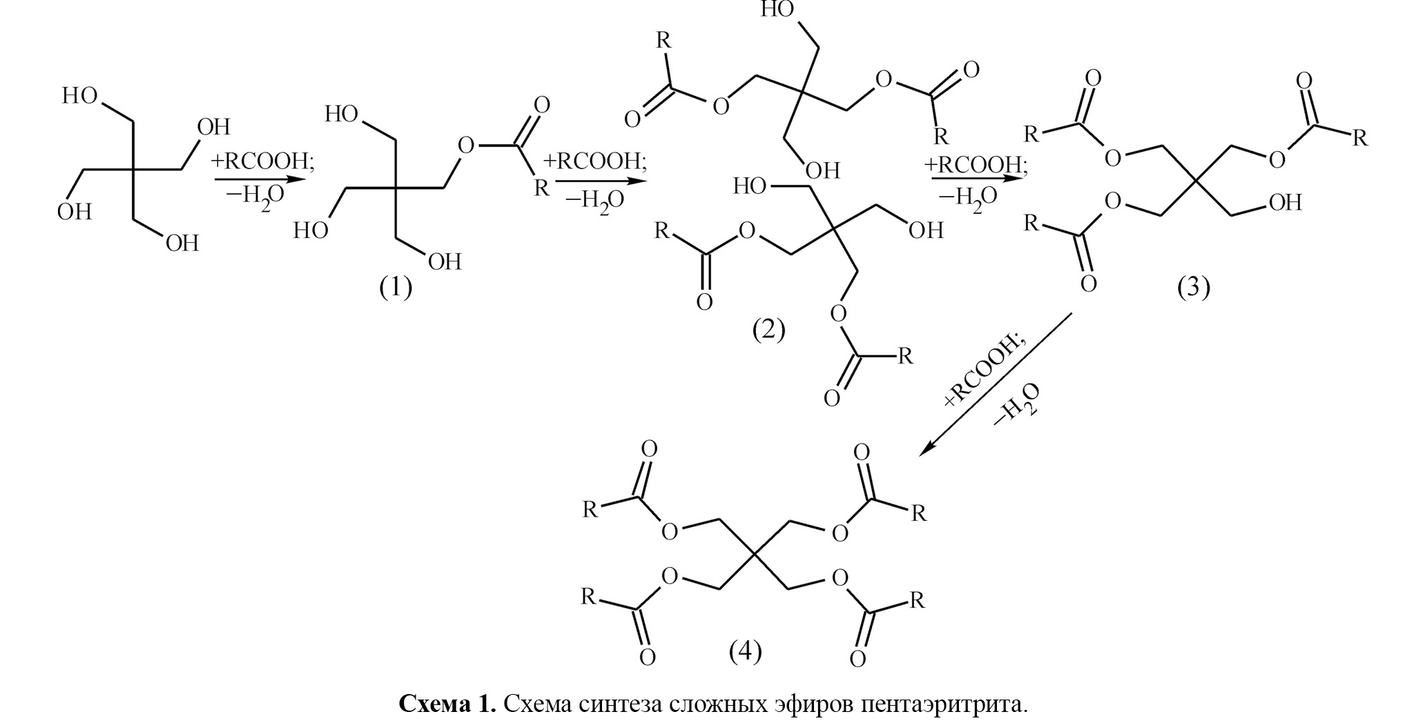 Сложные эфиры на основе пентаэритрита и карбоновых кислот С5–С10 обладают уникальными эксплуатационными свойствами и являются основой синтетических масел пятой группы, которые обеспечивают надежную работу газотурбинных двигателей при жестких эксплуатационных режимах [1–8]. Основной метод их получения – реакция этерификации, которая может быть реализована в режиме самокатализа или в присутствии кислотных катализаторов. На схеме 1 показаны реакции получения моно- (1), ди- (2), три- (3) и тетраэфиров (4) пентаэритрита.