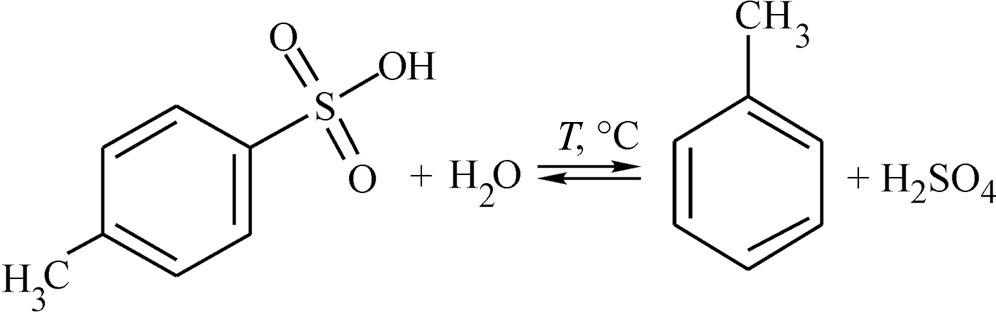 Отметим, что, хотя сульфокислоты и показывают сравнительно схожие результаты, однако пара-толуолсульфокислота обладает меньшей стабильностью в рассмотренных системах по сравнению с метансульфоновой кислотой в связи с возможным протеканием реакции гидролиза в кислой среде при нагревании, проходящей по следующей схеме: