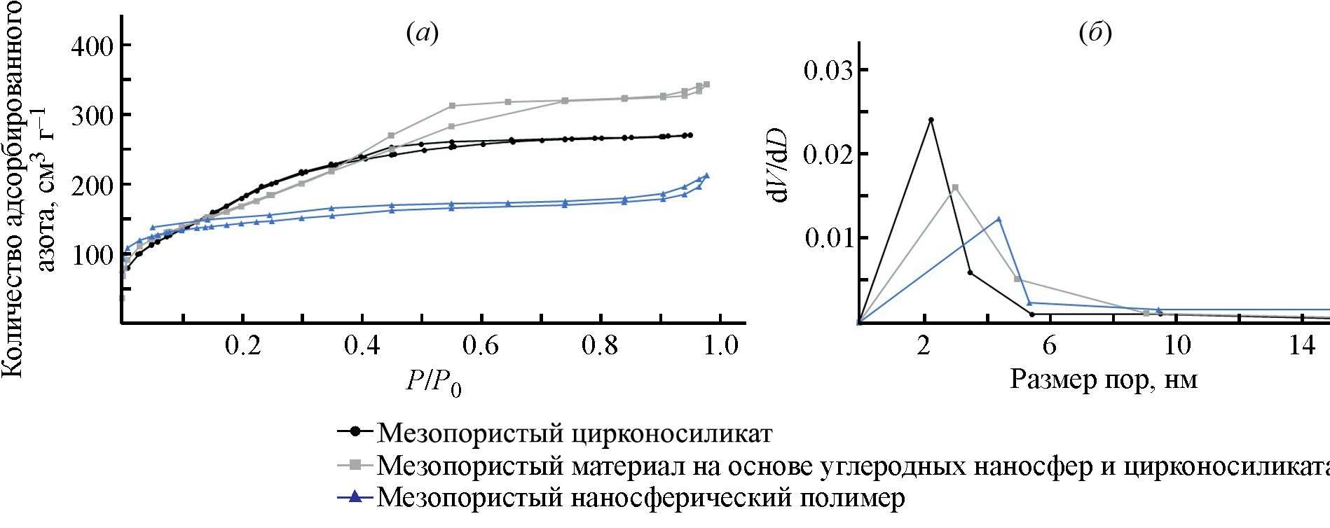Для синтеза композитного материала NSMP-m-Zr-Si на основе углеродных наносфер и цирконосиликата полученный материал NSMP (0.5 г) суспензировали в 44 мл водного раствора цетилтриметиламмония бромида (1.3 г). К суспензии по каплям добавляли 7.8 мл водного раствора Zr(SO4)2⸱4H2O (2.36 г) и перемешивали в течение 2 ч при комнатной температуре. Полученную реакционную смесь помещали в гидротермальный автоклав и выдерживали при 95°C в течение 48 ч. Материал после гидротермального синтеза промывали дистиллированной водой и суспензировали в 12 мл воды. Далее к водной суспензии циркониевого полупродукта, нанесенного на мезопористый полимер, по каплям добавляли гомогенный раствор 0.58 г SiO2 в смеси 5.4 мл воды и 3.8 мл гидроксида тетраэтиламмония. Материал отфильтровывали, промывали дистиллированной водой, сушили при 80–100°C, прокаливали при 550°C в течение 5 ч в атмосфере аргона.