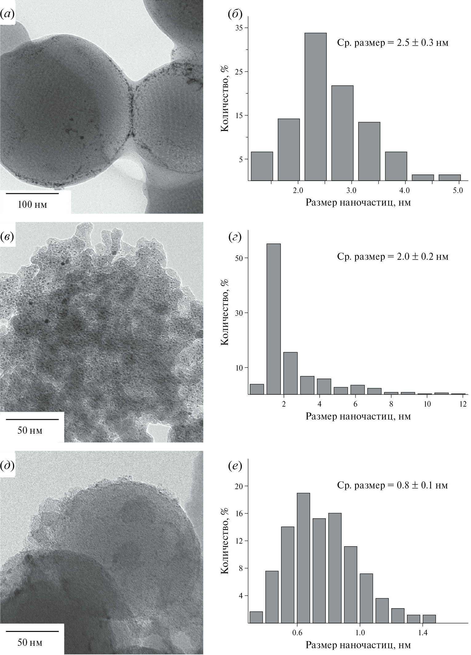 Рис. 4. Микрофотографии и распределения по размерам наночастиц Ru-катализаторов, нанесенных на: (а, б) – мезопористый наносферический полимер; (в, г) – мезопористый цирконосиликат; (д, е) – мезопористый материал на основе углеродных наносфер и цирконосиликата.