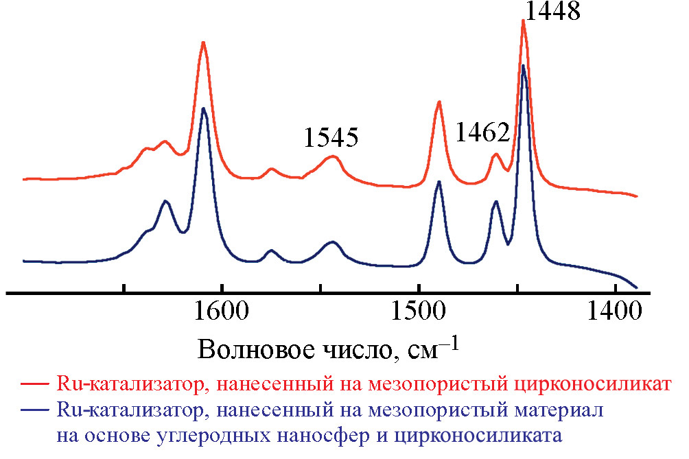 Согласно данным метода ИК-спектроскопии адсорбированного пиридина, в катализаторах Ru–m-Zr-Si и Ru–NSMP-m-Zr-Si присутствовали как бренстедовские (1545 см–1), так и льюисовские КЦ (слабые – 1448 см–1, сильные – 1462 см–1) (рис. 7, табл. 3) [18]. Катализатор Ru–NSMP-m-Zr-Si характеризовался большей концентрацией льюисовских КЦ, что может быть связано с наличием Ru в виде окисленных форм, которые также могут являться льюисовскими КЦ [19].