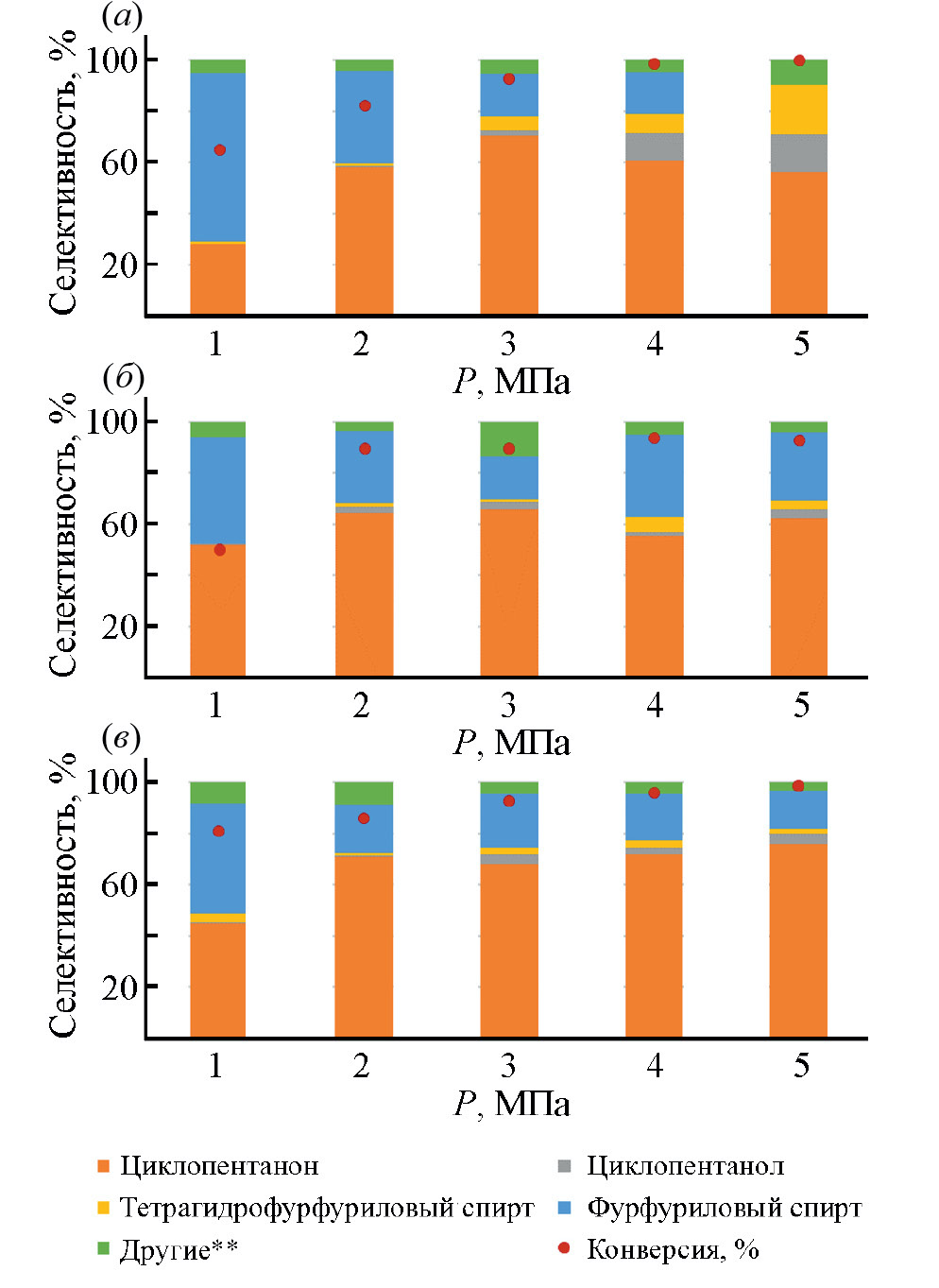 Повышение давления водорода свыше 2 МПа не оказывало существенного влияния на гидрирование фурфурола при 170°С (рис. 9). При 1 МПа водорода конверсия фурфурола менялась в следующем порядке: Ru–NSMP-m-Zr-Si (81%) > Ru–NSMP (65%) > Ru–m-Zr-Si (50%). Для катализатора Ru–m-Zr-Si образование циклопентанона происходило быстрее по сравнению с другими катализаторами. Также следует отметить, что в случае катализатора Ru–m-Zr-Si не было достигнуто полной конверсии фурфурола, что может быть связано с блокированием каталитических центров образованными продуктами конденсации.