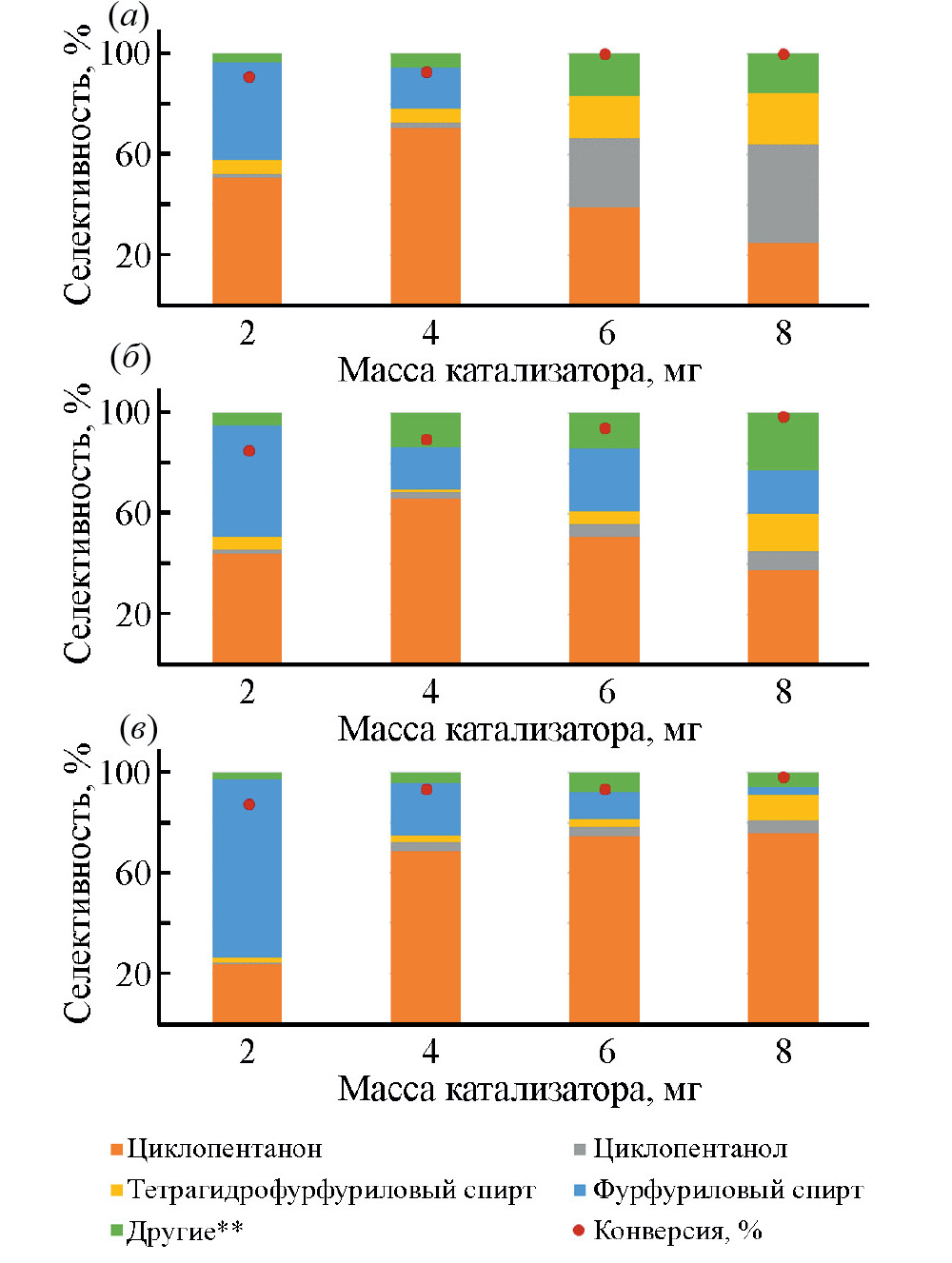 Увеличение массы катализатора приводило к образованию значительных количеств циклопентанола и тетрагидрофурфурилового спирта при загрузке катализатора Ru–NSMP и побочных продуктов при загрузке катализатора Ru–m-Zr-Si (рис. 10). В случае композитного катализатора Ru–NSMP-m-Zr-Si сохранялась высокая селективность образования циклопентанона (~75%).