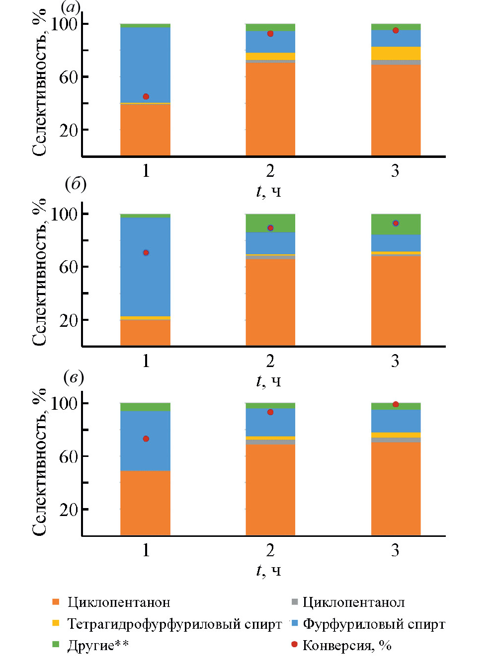 Температура оказывала существенное влияние на протекание реакции (рис. 8). При температуре 100°С наибольшая конверсия фурфурола (78%) была достигнута на катализаторе Ru–NSMP-m-Zr-Si. При температуре 150°С основным продуктом в случае катализаторов Ru–NSMP и Ru–m-Zr-Si был фурфуриловый спирт, в то время как в случае катализатора Ru–NSMP-m-Zr-Si – циклопентанон (69%). При увеличении температуры со 100 до 170°С конверсия фурфурола возрастала до 90–93% и возрастало количество образующегося циклопентанона. Наибольшая селективность образования циклопентанона (85%) достигнута в присутствии катализатора Ru–NSMP-m-Zr-Si при 200°С. С ростом температуры до 250°С для всех катализаторов в продуктах реакции обнаруживался циклопентанол, а в случае катализатора Ru–m-Zr-Si также значительное количество побочных продуктов (до 21.5%), что может быть связано с повышенной бренстедовской кислотностью неорганического носителя, способствующей реакциям полимеризации [20].