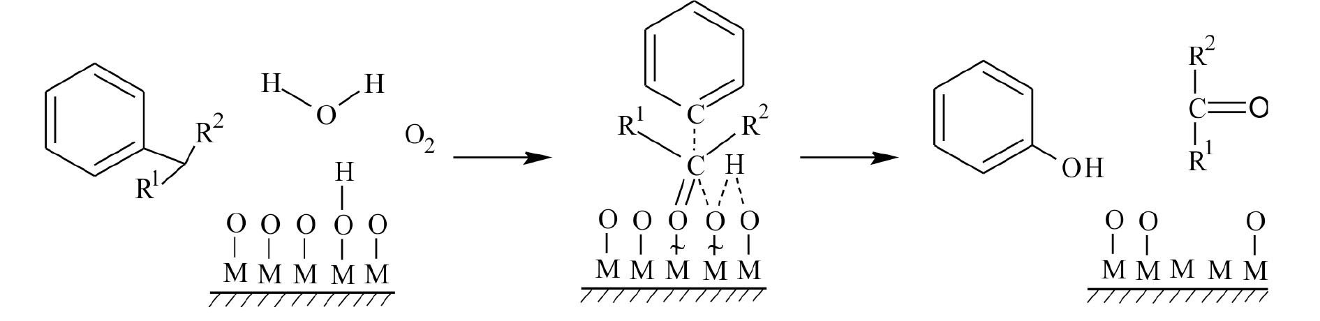 Установки каталитического крекинга – еще один значимый источник фенолов в сточных водах НПЗ. В этом случае основное количество загрязненных сточных вод образуется в процессе отпарки катализатора. После отпарки водяной пар из реактора поступает в ректификационную колонну, а затем вместе с бензиновыми парами и газом после конденсаторов направляется в газосепаратор, из которого технологический конденсат сбрасывают в канализацию. Такой технологический конденсат в основном загрязнен нефтепродуктами, сульфидами аммония, фенолом и другими растворенными в воде органическими веществами. Показано [14], что фенолы при каталитическом крекинге образуются в результате окисления алкилароматических углеводородов свободным кислородом по механизму „карбоксилатного“ комплекса [15] (схема 1).