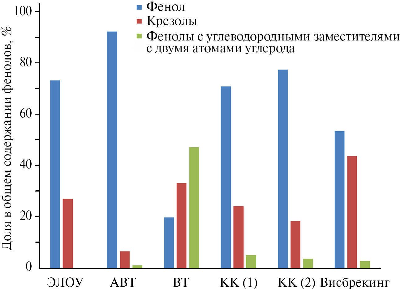 Во вторичных процессах по сравнению с атмосферно-вакуумной перегонкой наблюдается увеличение доли гомологов фенола. Особенно это заметно проявляется в процессе висбрекинга, где на долю крезолов приходится более 40%. Природа используемого сырья в процессе каталитического крекинга не оказывает существенного влияния на распределение фенолов в кислой воде.