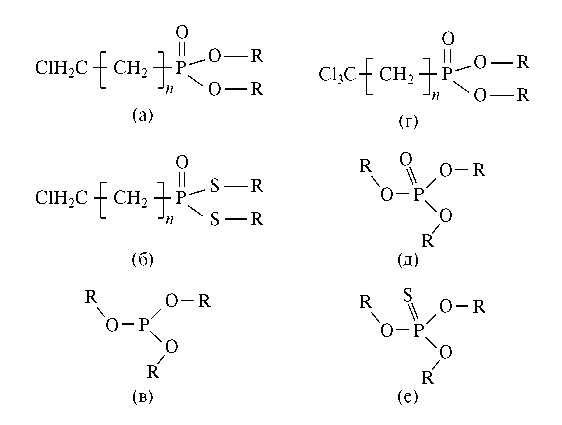 Рис. 1. Фосфор- и хлорфосфорорганические присадки, полученные в ИНХС РАН: а) эфиры хлоралкилфосфиновых кислот; б) тиоэфиры хлоралкилфосфиновых кислот; в) триалкилфосфиты; г) эфиры трихлоралкилфосфиновых кислот; д) триалкилфосфаты; е) триалкилмонотифосфаты.