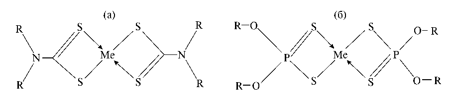 Рис. 3. Диалкилдитиокарбаматы (а) и диалкилдитиофосфаты (б) металлов.