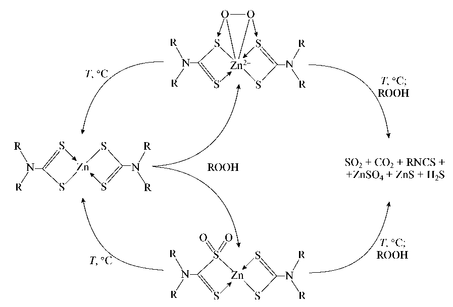 В связи с тем, что в качестве перспективных антиокислительных присадок были выбраны диалкилдитиокарбаматы цинка, обладающие не только хорошими антиокислительными свойствами, но и наименьшей токсичностью, было проведено детальное исследование процесса окисления углеводородных сред, содержащих такие присадки, для установления механизма ингибирующего действия и природы образующихся промежуточных соединений [17]. Для этого были применены различные физико-химические методы анализа (ИК- и ПМР-спектрометрия, термический и элементный анализ). Было достоверно установлено, что в условиях высокотемпературного окисления углеводородов в присутствии диалкилдитиокарбамата цинка из него образуются два кислородсодержащих комплекса. На основании полученных данных была предложена схема антиокислительного действия дитиокарбаматов цинка в условиях высокотемпературного окисления, учитывающая как превращение исходного ингибитора и промежуточных соединений с гидропероксидами, так и их термическое превращение (рис. 4).