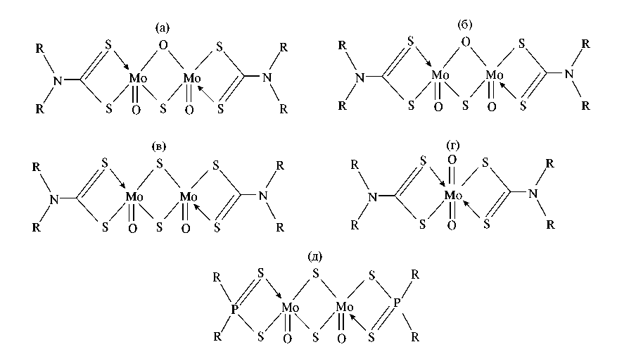 Рис. 5. Функциональные присадки на основе комплексных соединений молибдена: а) ди-μ-оксосульфо-диоксо-диалкилдитиокарбамат димолибдена(V); б) ди-μ-оксосульфо-дисульфидо-диалкилдитиокарбамат димолибдена(V); в) ди-μ-сульфо-дисульфидо-диалкилдитиокарбамат димолибдена(V); г) диоксо-диалкилдитиокарбамат молибдена(VI); д) ди-μ-сульфодиоксо-диалкилдитиофосфат димолибдена(V).