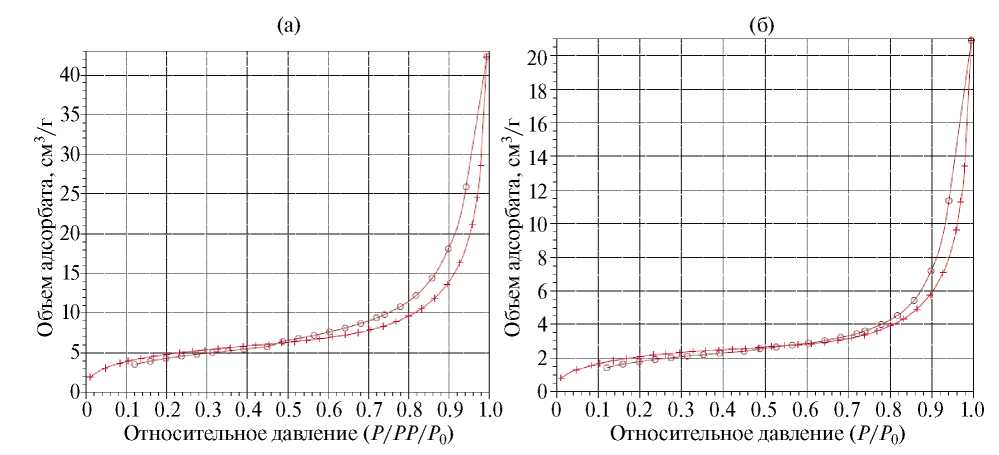 Рис. 1. Изотерма адсорбции N2 на образцах Fe-ПВС-250 (а) и Fe-ПВС-500 (б).