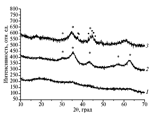 Рис. 2. Дифрактограммы композитов Fe-ПВС, полученных термообработкой смесей нитрата железа и поливинилового спирта при различной температуре, °С: (1) – 250, (2) – 350, (3) –500 (* – рефлексы, относящиеся к магнетиту; • – рефлексы, относящиеся к цементиту).