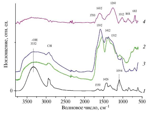 Рис. 3. ИК-спектры исходного ПВС (1) и образцов, полученных термообработкой при различной температуре, °С: (2) – 250; (3) – 350; (4) – 500.