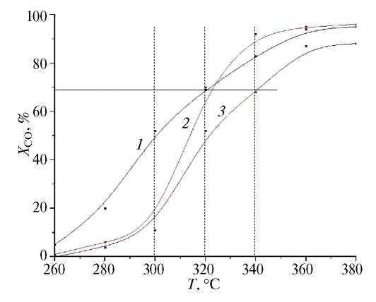 Рис. 4. Зависимость конверсии монооксида углерода от температуры осуществления процесса СФТ для композитных катализаторов: (1) – Fe-ПВС-250; (2) – Fe-ПВС-350; (3) – Fe-ПВС-500.