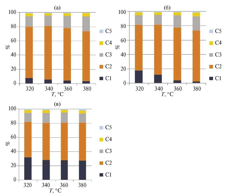 Жидкие углеводороды анализировали на хроматографе „Кристаллюкс-4000М“, детектор – пламенно-ионизационный. Скорость подачи газов: азот – 30 мл/мин, водород – 25 мл/мин, воздух – 250 мл/мин. Для анализа использовали капиллярную колонку OV–351 (50 м × 0.32 мм). Температурный режим: 50°С (2 мин) – 50–260°С, 6°С/мин – 260–270°С, 5°С/мин –270°С (10 мин).