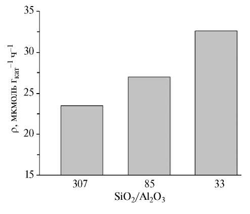 Как следует из табл. 4, с уменьшением SiO2/Al2O3 от 307 до 33 растет концентрация средних (I) и сильных (II) кислотных центров, что приводит к повышению общей кислотности. При этом соотношение I/II также увеличивается (от 0.66 до 1.19). Следует отметить, что, по данным ИК-спектроскопии адсорбированного пиридина, используемые в работе катализаторы характеризуются разным распределением БКЦ и ЛКЦ, причем доля БКЦ значительно превышает долю ЛКЦ, которая в свою очередь увеличивается с ростом SiO2/Al2O3. Так, повышение SiO2/Al2O3 от 33 до 307 сопровождается увеличением соотношения БКЦ/ЛКЦ от 3.7 до 16.0.