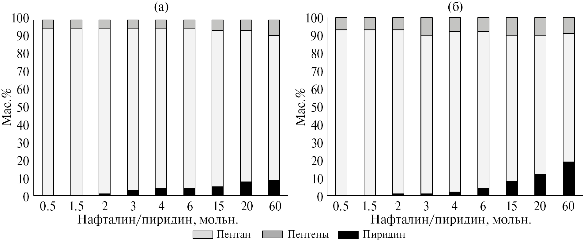 Степень превращения пиридина также зависит от состава реакционной смеси (рис. 2а, б). При мольном отношении нафталин/пиридин не превышающем 2, пиридин практически полностью превращается в пентан, доля пентенов в продуктах не превышает 7% (рис. 2б). Увеличение содержания нафталина (отношения нафталин/пиридин от 15 до 60 мольн.) приводит к существенному росту доли непревращенного пиридина — до 12 и 19% при мольном соотношении S/W 4/1 и 10/1 соответственно. Как и в случае чистого пиридина (табл. 1), пиперидин и пентиламин в продуктах не обнаруживали.
