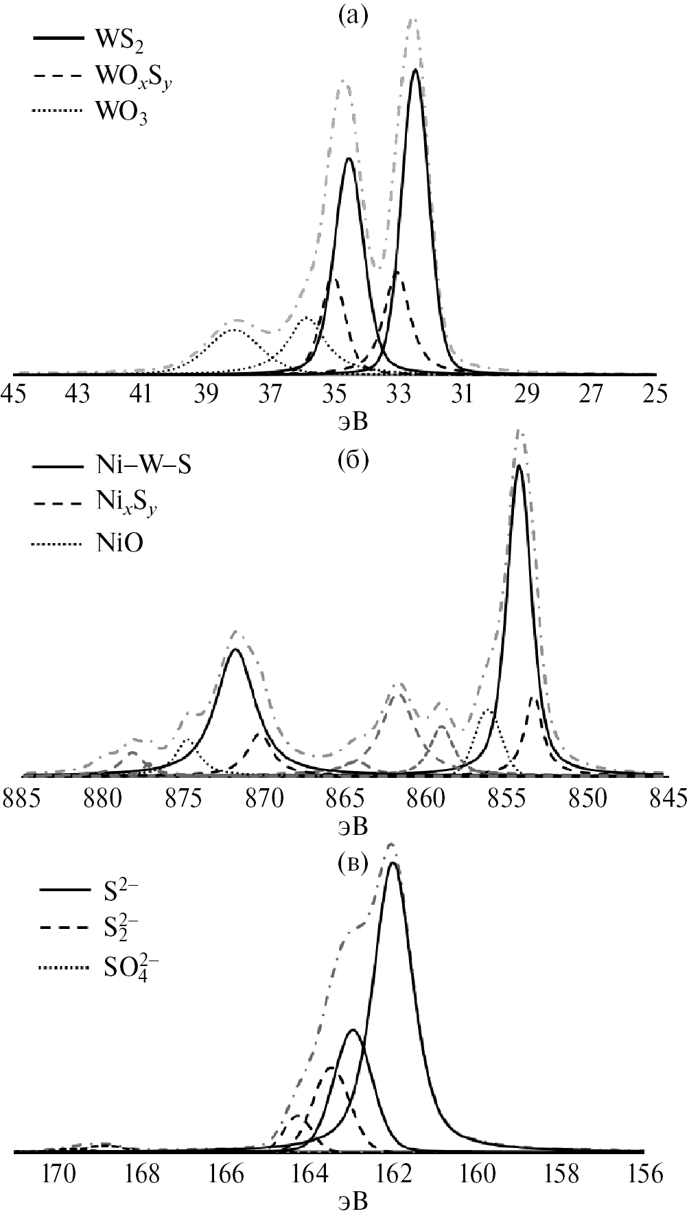 Деконволюция W4f уровня (рис. 5а) позволила установить присутствие трех форм вольфрама: сульфидной WS2, оксисульфидной WOxSy и оксидной WO, о чем свидетельствует наличие соответствующих сигналов на спектрах (рис. 5) [37, 45]. Никель находится в трех состояниях: сульфидном NiхSу, оксидном NiO и в составе смешанной никель-вольфрам сульфидной фазы Ni–W–S [21, 45] (рис. 4б). Сера в составе катализатора преимущественно присутствует в сульфидной форме S2–, а также сульфатной SO42– и S22– [21, 46] (рис. 5в).