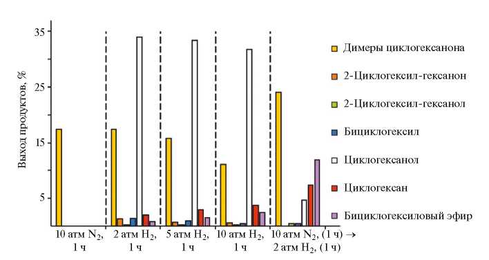 При последовательном проведении реакций конденсации циклогексанона в среде азота при 10 атм и гидрирования полученных продуктов в среде водорода при 2 атм конверсия циклогексанона составила 49%. Димеры циклогексанона были основными продуктами реакции, их выход составил 24%. Также в продуктах реакции в большом количестве присутствовали бициклогексиловый эфир (выход 12%) и циклогексан (выход 7%), образующиеся из циклогексанола. В то же время выход бициклогексила был всего 0.5% — что ниже, чем в случае проведения реакции в режиме one-pot. Это может быть связано с более медленной диффузией димеров циклогексанона из объема раствора к наночастицам палладия, в результате чего интенсивнее происходит реакция гидрирования циклогексанона до циклогексанола и следующие за ним реакции дегидратации–гидрирования и этерефикации.