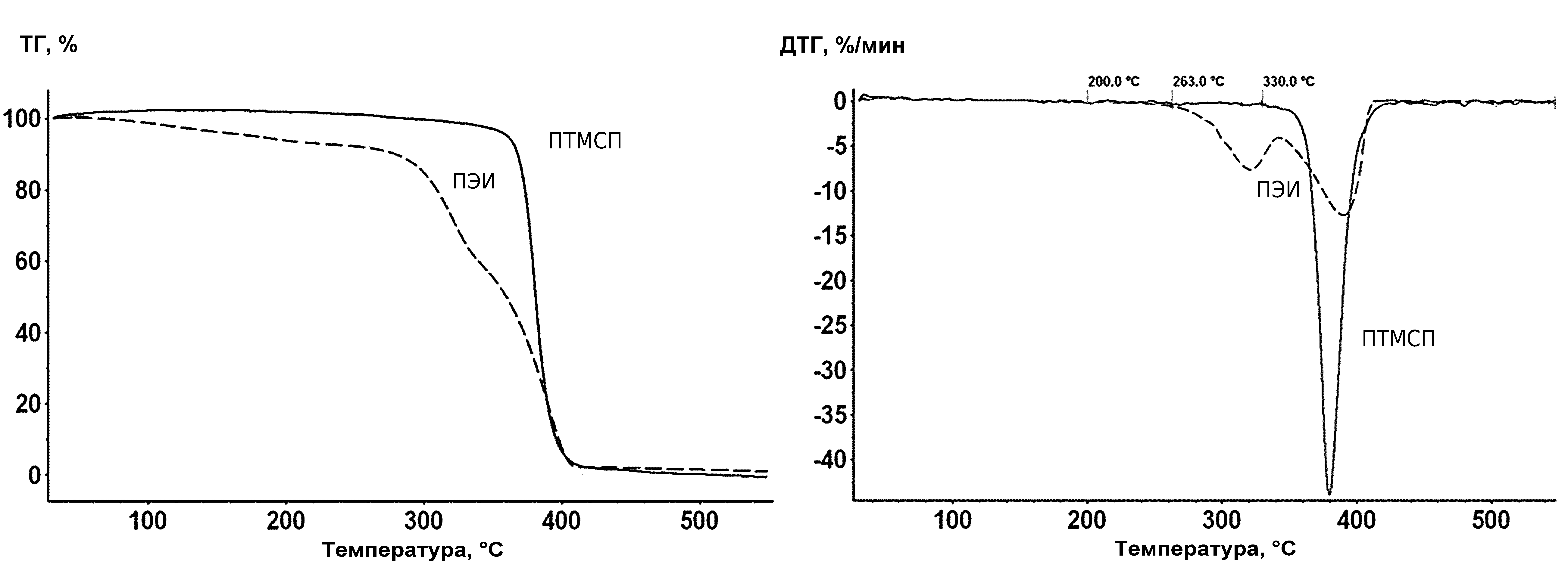 Термогравиметрический анализ (ТГА) исходного и модифицированного полиэтиленимином поли(1-триметилсилил-1-пропина) проводили на приборе NETZSCH STA 409 при скорости нагрева 10°C/мин в инертной среде (He).